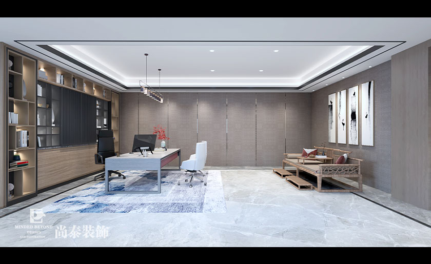 董事长办公室采用中式简约设计风格,方正格局,黑白色和木色渗透平衡,中式班台、背景墙、茶台、椅子、博古架、灯具、挂画等让空间气质非凡,现代与传统的融合,大有指点江山、胸怀天下之气度。