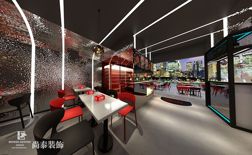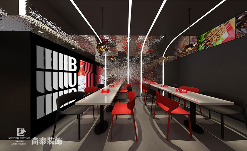 本案为200平米烧烤啤酒主题餐饮店装修设计,深圳装修公司尚泰装饰设计师采用大量流行的水波纹新材料进行装饰设计,融入众多新潮时尚年轻特色元素,打造亮眼网红式的用餐环境,深受年轻消费群体的欢迎。