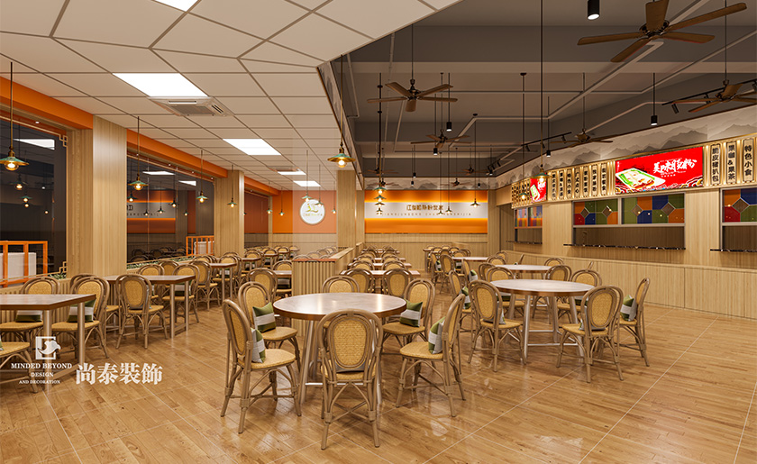 本案主色调采用品牌主题色橘红色系,通体橘红色门头外观以大气店名主题、格栅造型加透明隔墙、橱窗展示的形式吸引受众消费者,非常显眼而有创意感。室内部分采用局部吊顶,其余裸顶喷漆处理,地面和墙面均以木质材料装饰,更自然清新。两店既有共通之处,也各有特色,一店以年轻时尚为主,另一店则更古朴厚重,采用中式吊灯、墙绘和传统桌椅,宾客居于其间,可体验深远的传统肠粉餐饮文化。