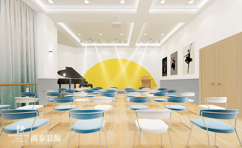 局部搭建了夹层,共三层楼,六间教室、一间校长办公室,其中包含了大的礼堂平时可作为舞蹈室。