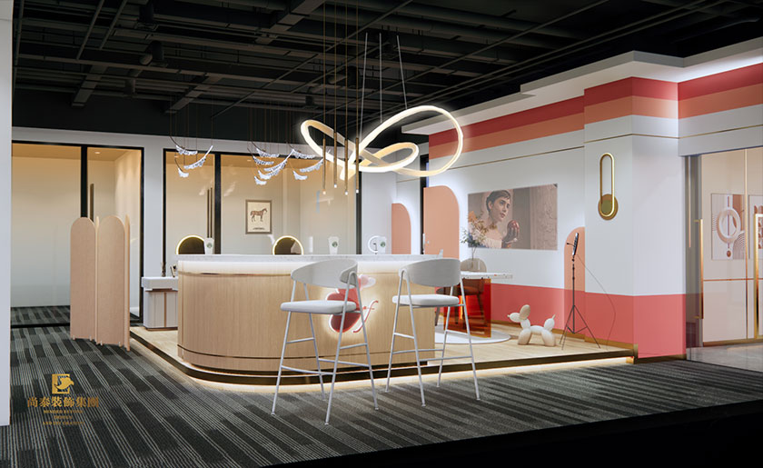 本案为美容美业教育培训机构门店装修设计,深圳装修公司尚泰装饰设计师在前厅区域采用了最能体现浪漫的莫兰迪蓝色,且用卡其色作为过渡色,柔和细腻,打造唯美舒适的视觉质感。