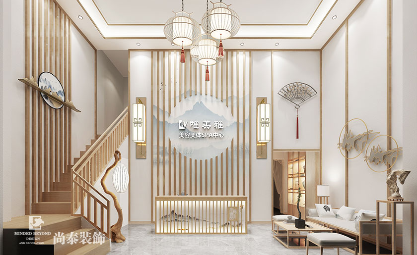 美容行业以新中式禅意风为主要基调。设计师采用白色配以活波的色彩,为客户打造一个适合修身养心的舒适空间。