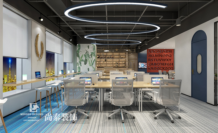 配置人体工学桌椅、智能照明与新风系统,保障长期办公舒适度;预留多接口电源与高速网络线路,适配移动办公与数据处理需求,施工阶段由尚泰装饰全程把控进度与质量。
